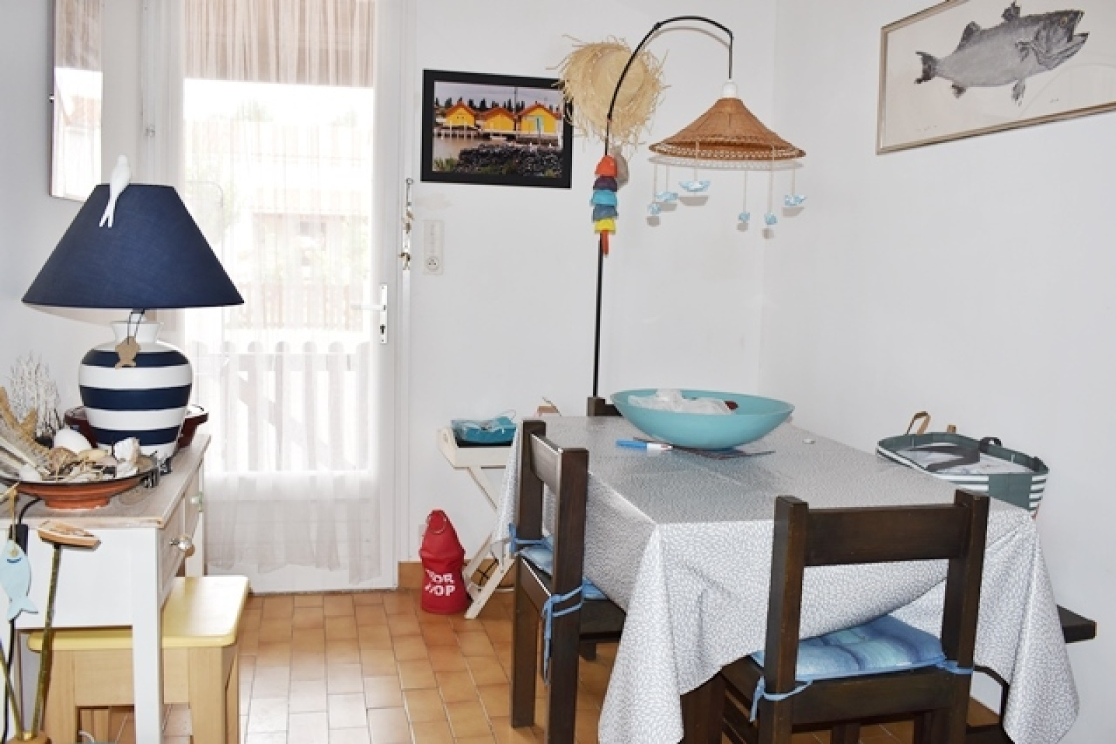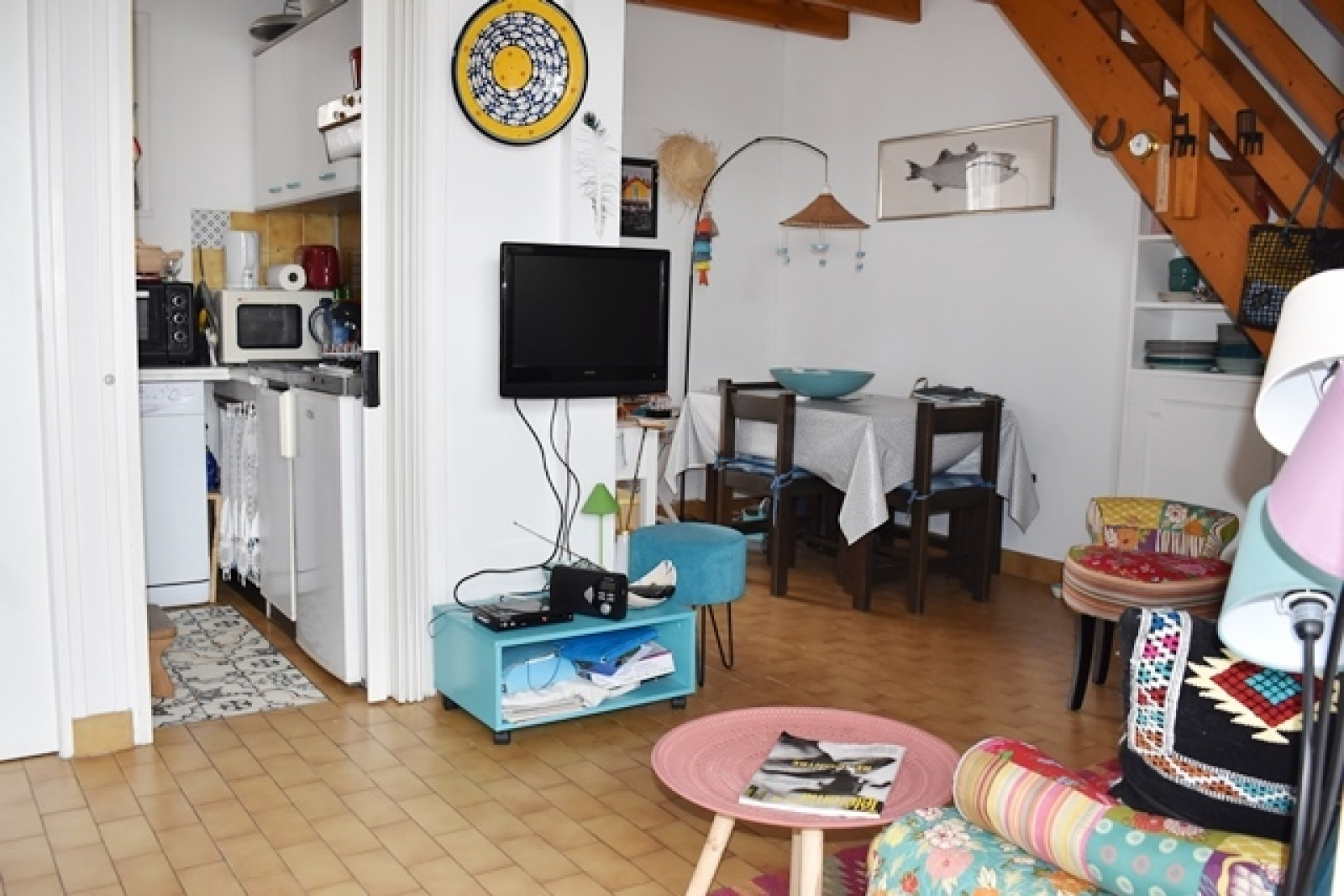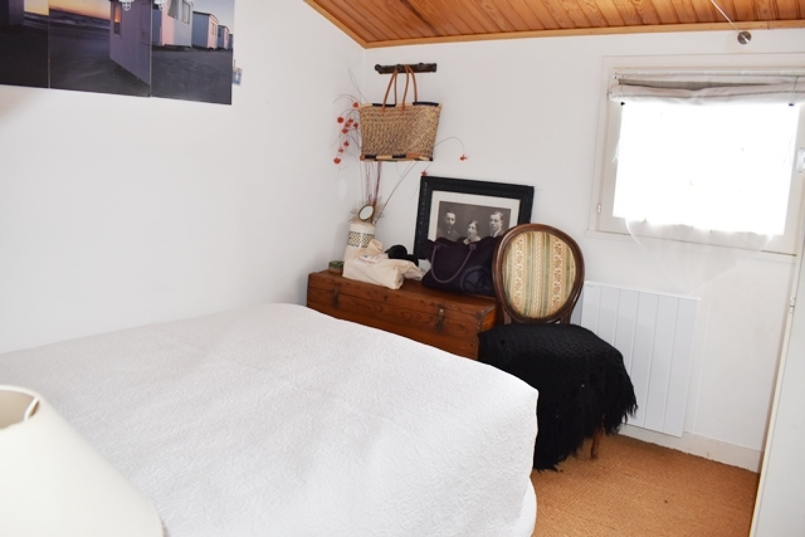 A 300m des commerces et 400m de la plage, maison de vacances comprenant un séjour, une kitchenette, une salle d'eau avec wc, à l'étage; un palier avec deux couchages et deux chambres en enfilade dont une mansardée. Attenant un cellier, une cour arrière de 7.70m² exp ouest, une cour devant de 25.20m² dont 10m² de terrasse couverte et une place de parking. Idéal pour de la location.