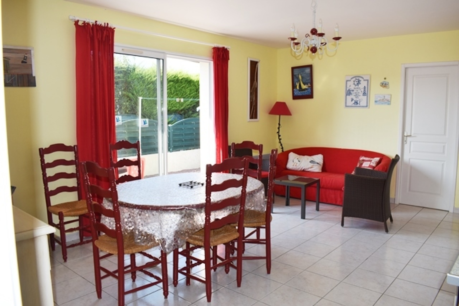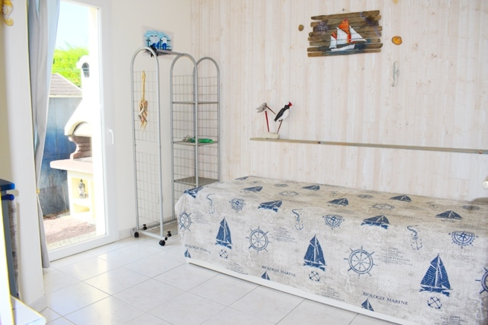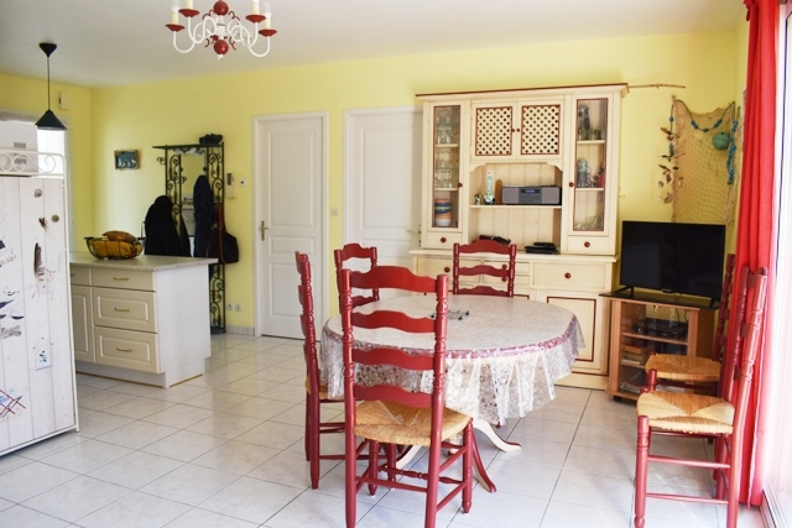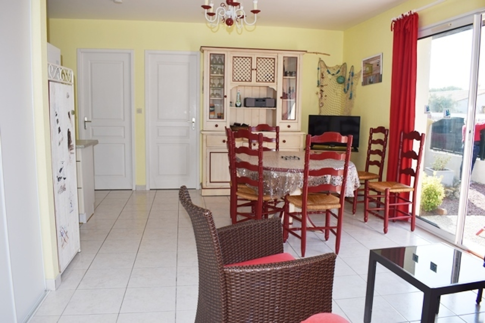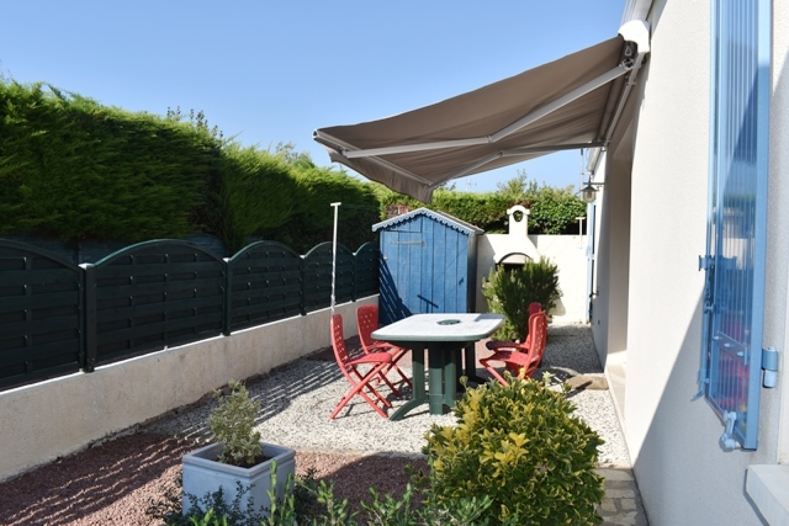 Proche des commerces et de la plage, cette agréable maison de 2000, comprend une pièce de vie avec cuisine ouverte aménagée, trois chambres, une salle d'eau et un wc séparé. Attenant un cellier carrelé. Un espace arboré devant la maison avec une place de parking et une cour sur l'arrière avec un store banne, une cabane de jardin et un barbecue.