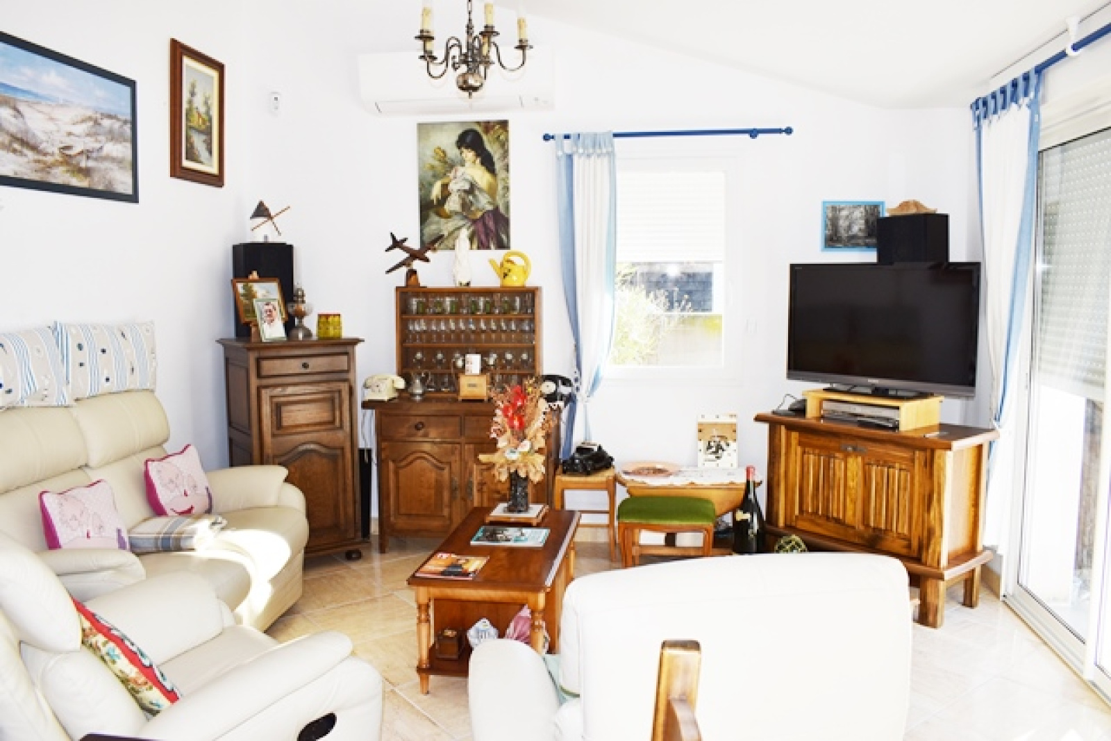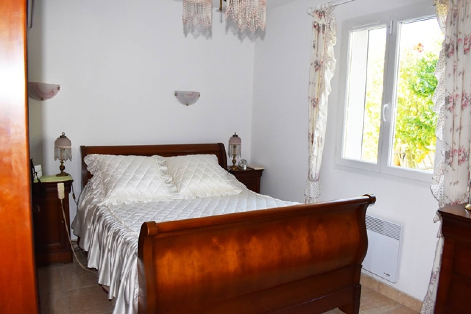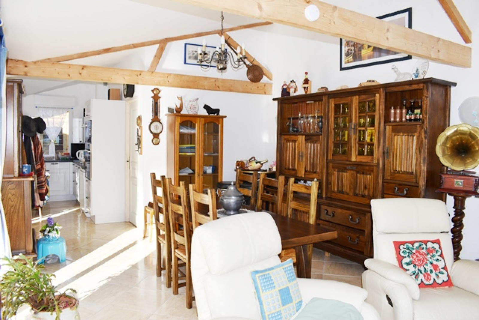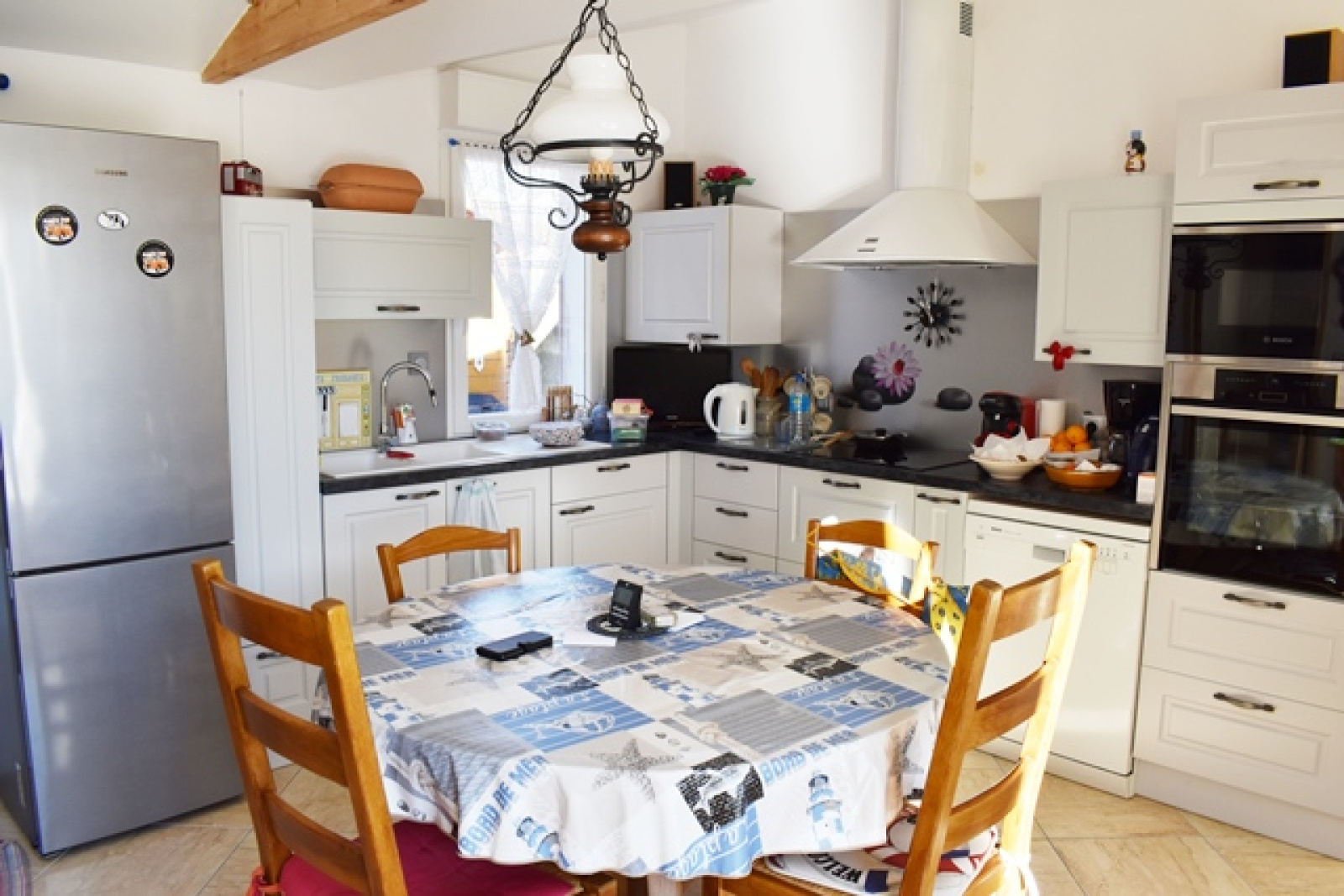 Maison de 2001 comprenant une cuisine aménagée ouverte sur un salon/séjour, un cellier, 3 chambres, une salle d'eau, wc séparé, attenant un garage. Cabanons en bois.