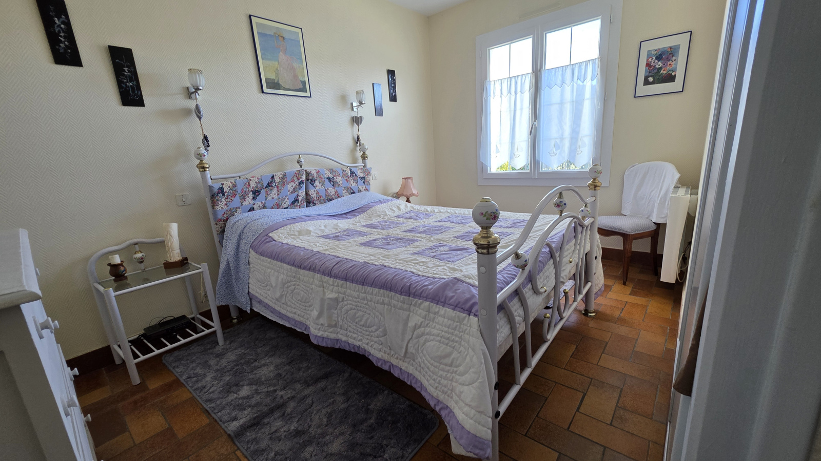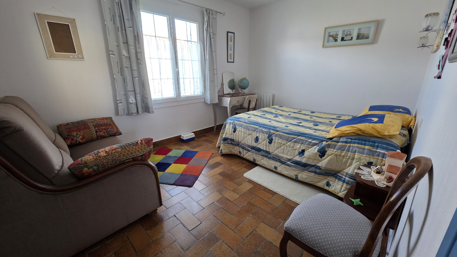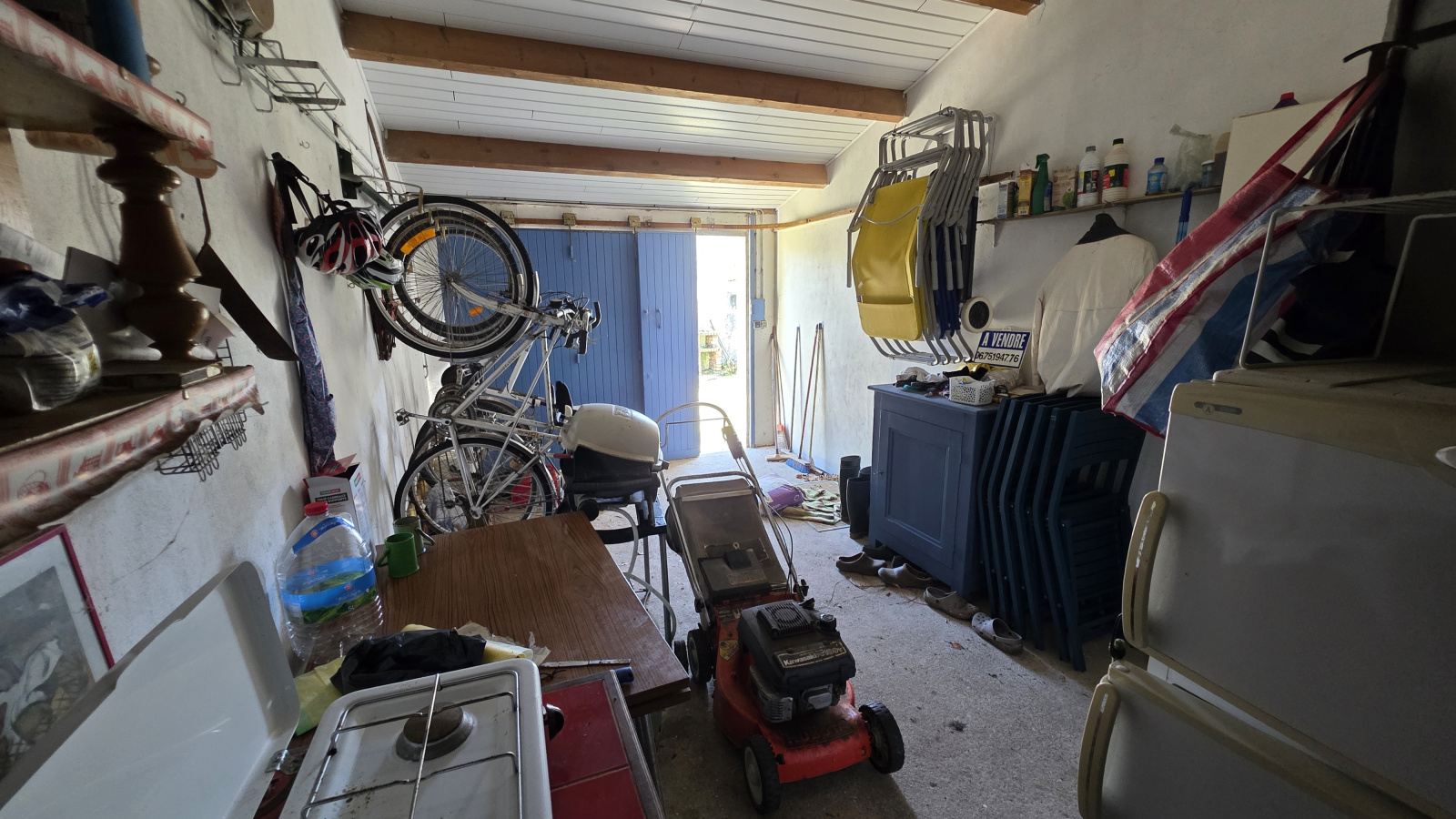 A 5min à pied de la plage, cette maison comprend une entrée, une cuisine aménagée, une belle pièce de vie avec un poêle à bois, dégagement, trois chambres, une salle d'eau, un wc séparé. Attenant un garage. Très beau terrain clos et arboré.
