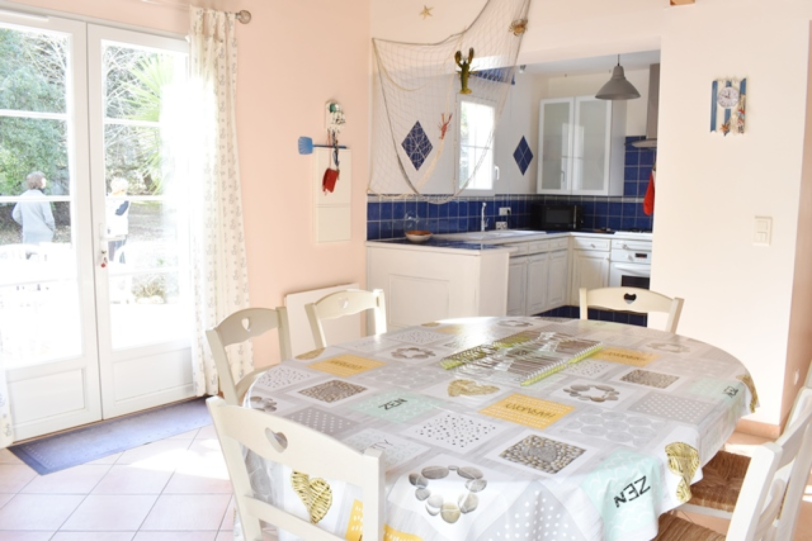A 500m de la plage, cette maison de 2003 au calme comprend une pièce de vie avec une cuisine ouverte aménagée, dégagement, deux chambres avec placards, une salle d'eau, un wc séparé, à l'étage une mezzanine de 16m² (3ème chambre). Deux terrasses carrelées avec 2 stores bannes. Beau terrain boisé.